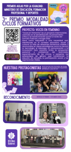 Nuestro alumnado del Ciclo Formativo de Grado Superior de Promoción de la Igualdad de Género (curso 24-25) ha sido galardonado con el tercer premio en la modalidad de ciclos formativos de los Premios Aulas por la Igualdad.
